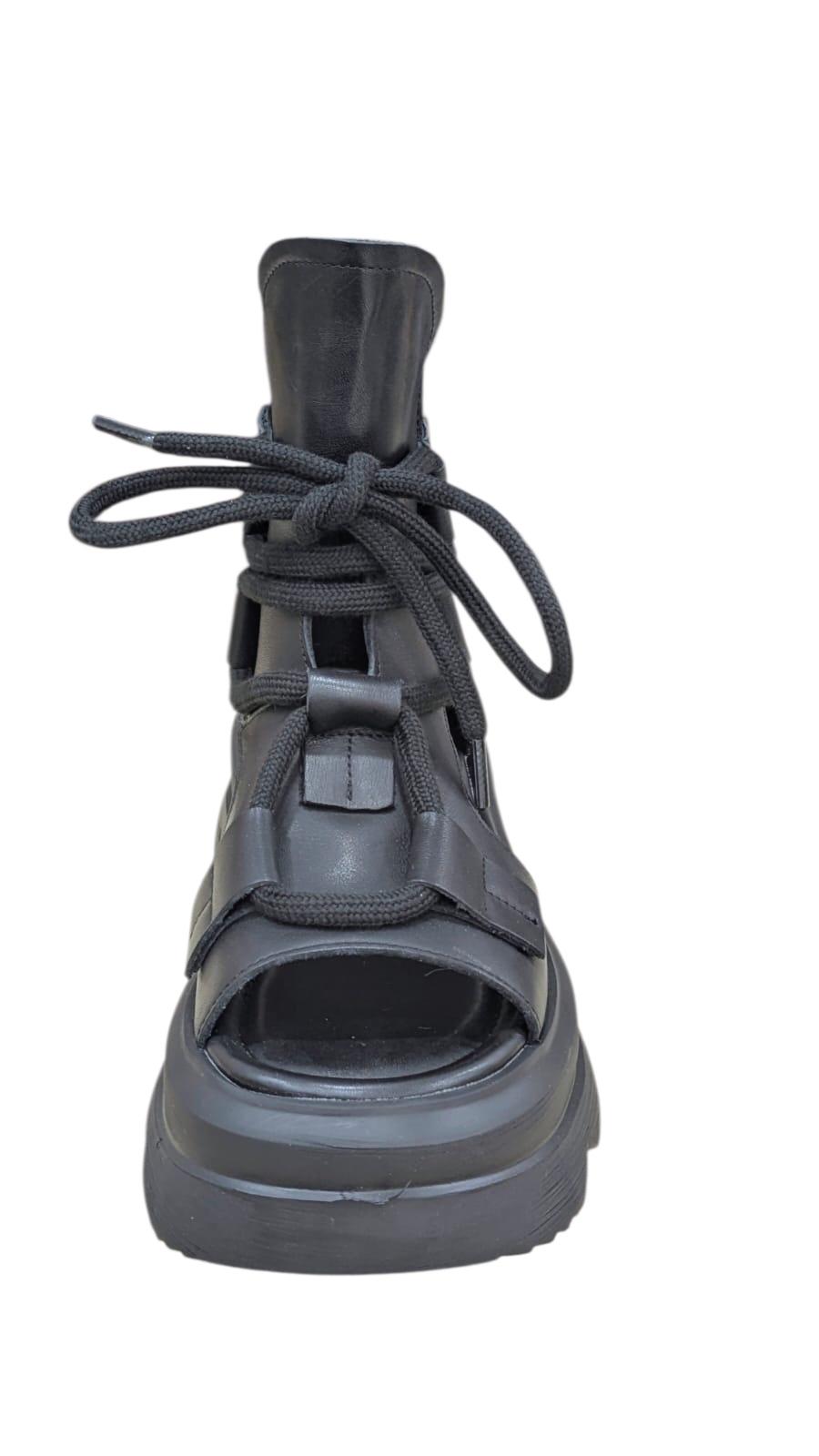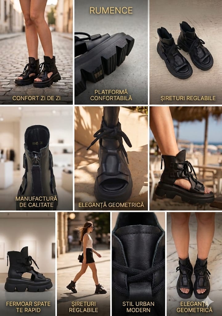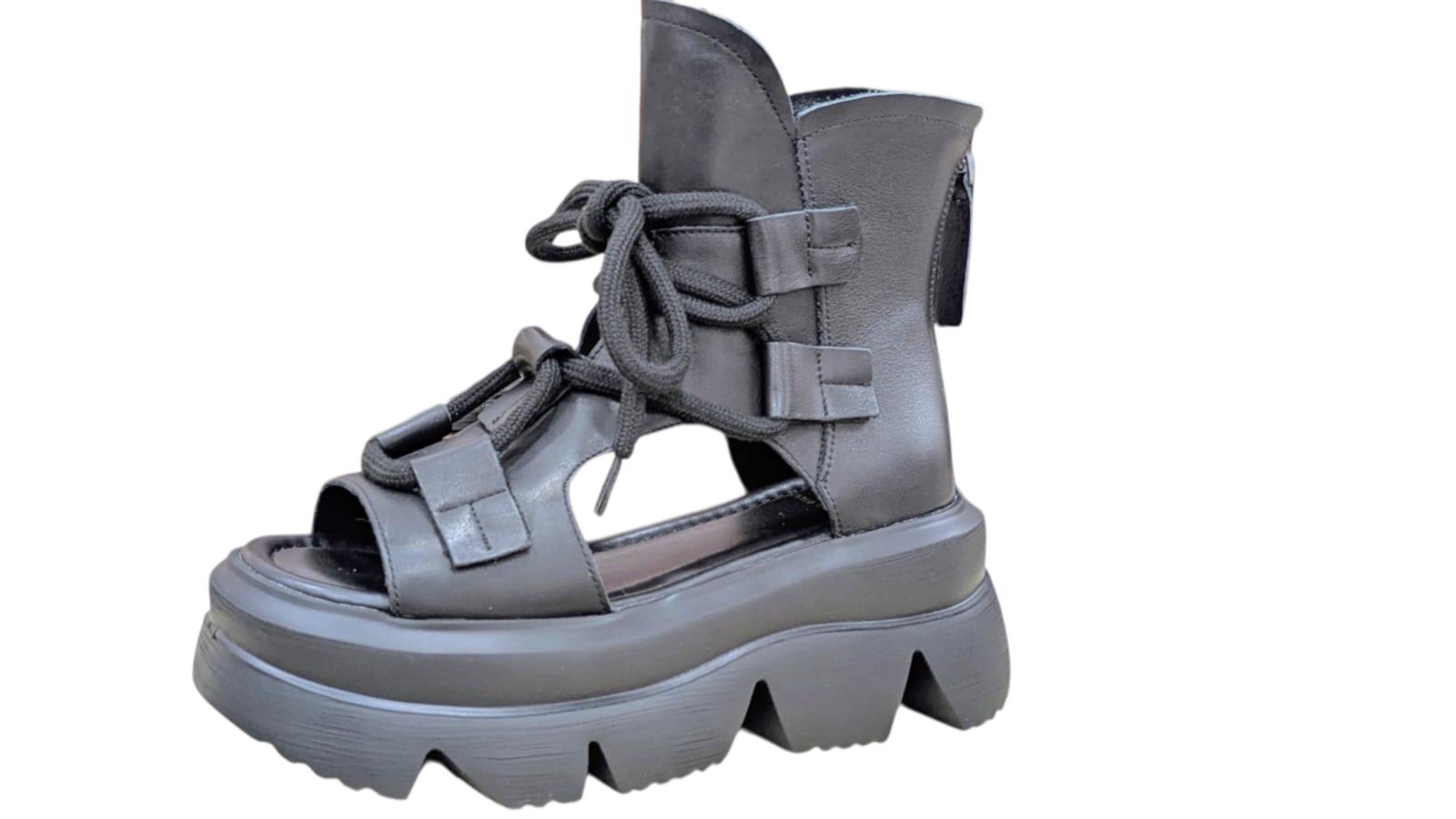 Eleganță Rebelă și Confort Suprem în Fiecare Pas! Descoperă combinația perfectă între stilul urban modern și calitatea tradițională.; Aceste sandale tip botină, realizate din piele naturală de înaltă calitate, sunt create pentru femeia care dorește să iasă în evidență fără a compromite confortul.; Caracteristici Principale: Material de Premium: Confecționate integral din piele naturală, oferind durabilitate și o textură fină la atingere.; Design Unic: Stil gladiator modern, cu decupaje laterale chic și șireturi groase care permit o ajustare perfectă pe picior.; Platformă Confortabilă: Talpa groasă și zimțată nu doar adaugă câțiva centimetri înălțime, dar asigură și o stabilitate excelentă pe orice suprafață.; Închidere Practică: Dotate cu fermoar la spate pentru o încălțare rapidă și ușoară.; Versatilitate: Ideale pentru ținute casual, festivaluri sau ieșiri în oraș, potrivindu-se perfect atât cu fuste scurte, cât și cu pantaloni denim.; Specificații Tehnice: Exterior: Piele Naturală.; Interior: Căptușeală moale pentru confortul zilnic.; Talpă: Material ușor și rezistent (Platformă).; Culoare: Negru Mat.; Transformă-ți stilul cu o piesă statement care nu trece niciodată neobservată!